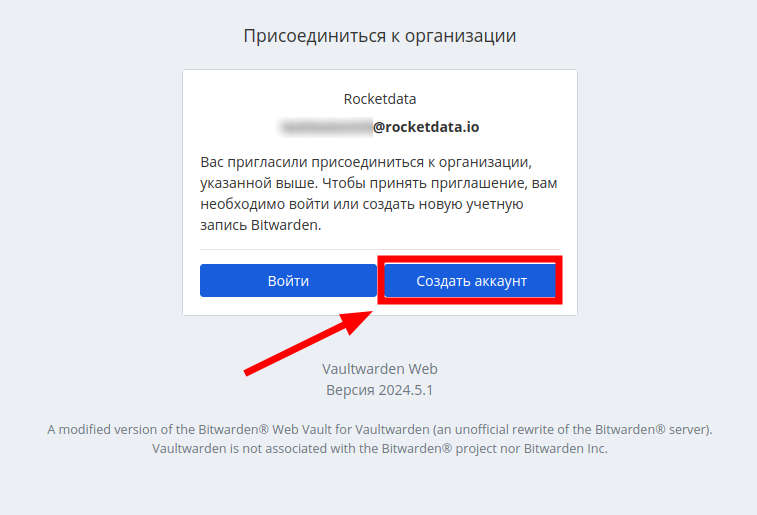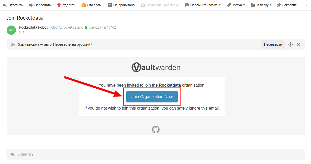 Нужно открыть это письмо и нажать “Join Organization Now”: