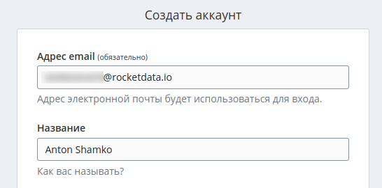 - В форме “Создать аккаунт” НЕ изменяем “Адрес email”. В поле “Название” пишем имя и Фамиию на латинице, например: