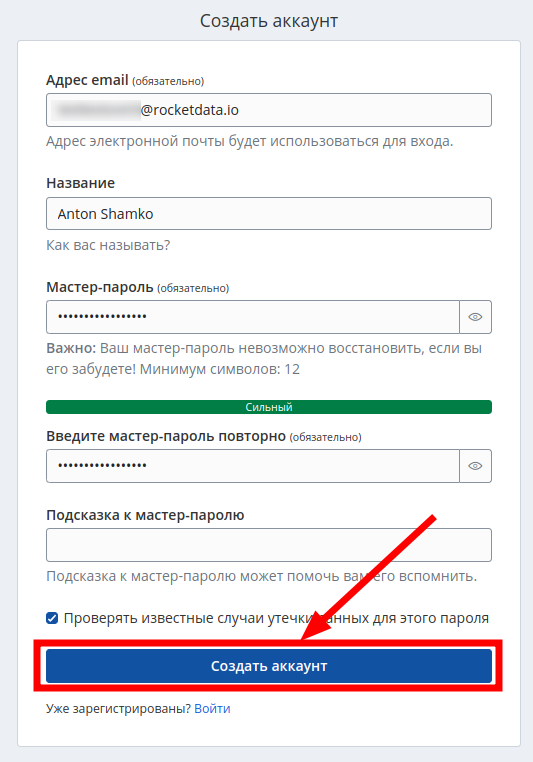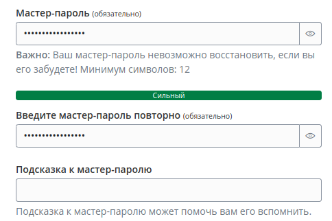 Затем нужно придумать мастер-пароль. Этот пароль должен содержать как минимум 12 символов и иметь оценку “Хороший” или “Сильный”. Подсказку к паролю заполнять НЕ нужно:
