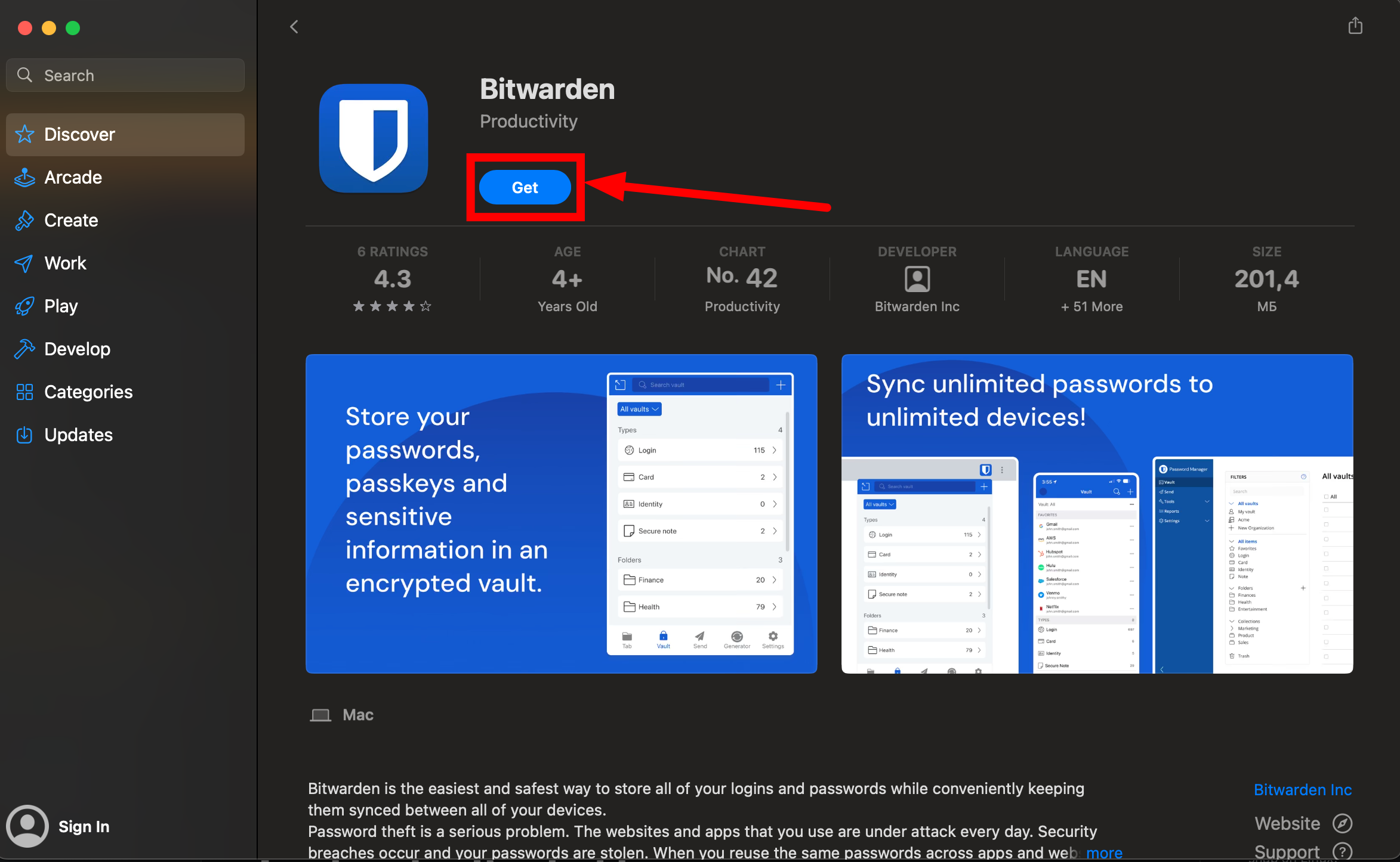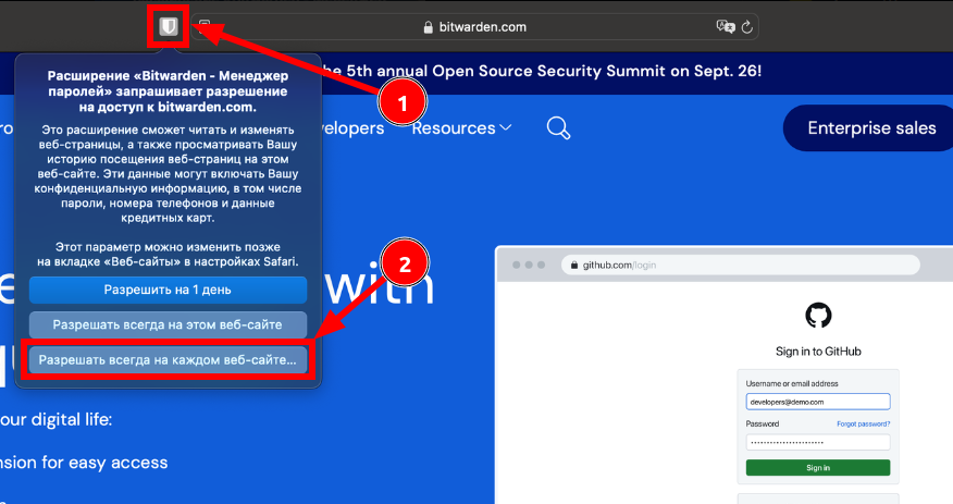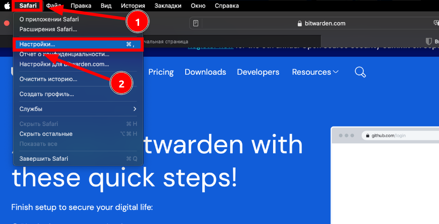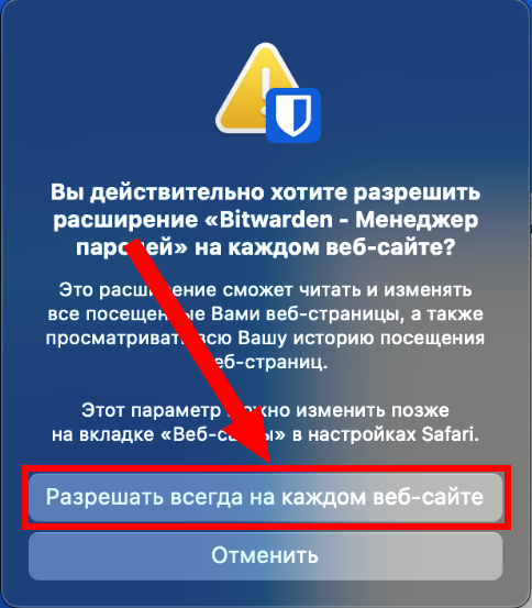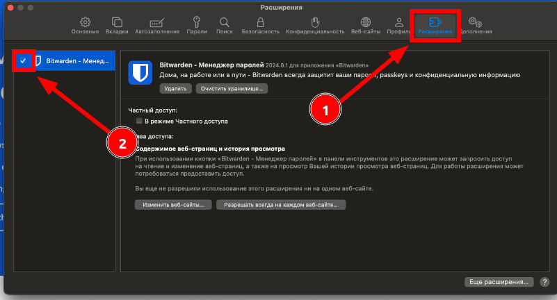 Если Вы пользуетесь Safari, то нужно установить приложение Bitwarden из Mac App Store:Bitwarden. Расширение для Safari будет установлено вместе с приложением: