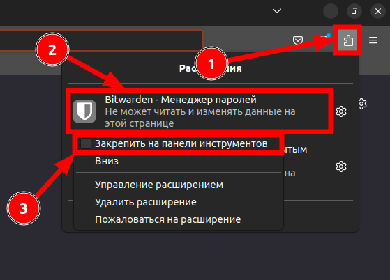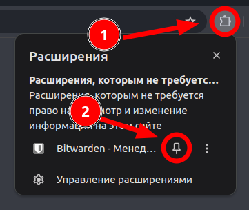 справа вверху и закрепить расширение Bitwarden: