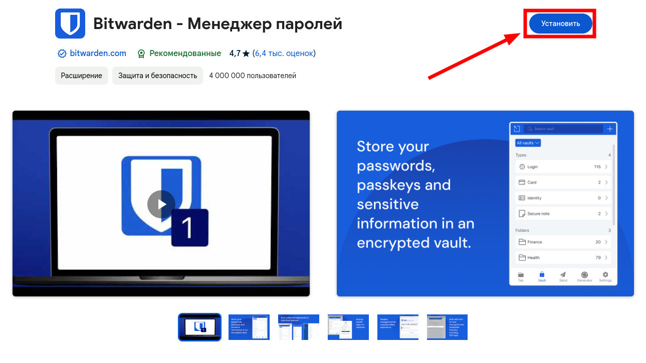 Bitwarden Password Manager - Chrome Web Store, затем нажать “установить”: