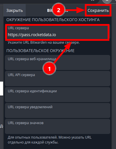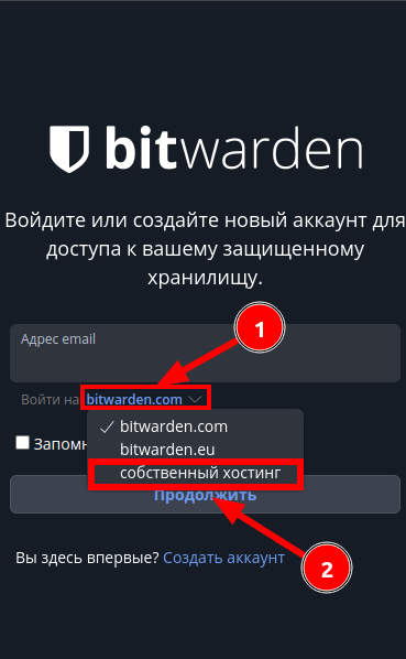 . Откроется окно входа в Bitwarden. Нужно нажать на “Войти на:” и выбрать “собственный хостинг”: