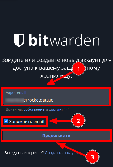 - Bitwarden снова предложит ввести вашу почту. Нужно ввести рабочую почту, с помощью которой регистрировались в Bitwarden, для удобства лучше нажать “Запомнить email”, потом нажать продолжить: