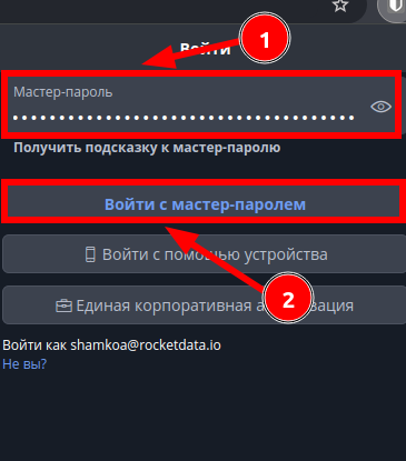 - Далее вводим мастер-пароль, который придумывали на этапе регистрации и нажимаем “Войти с мастер-паролем”: