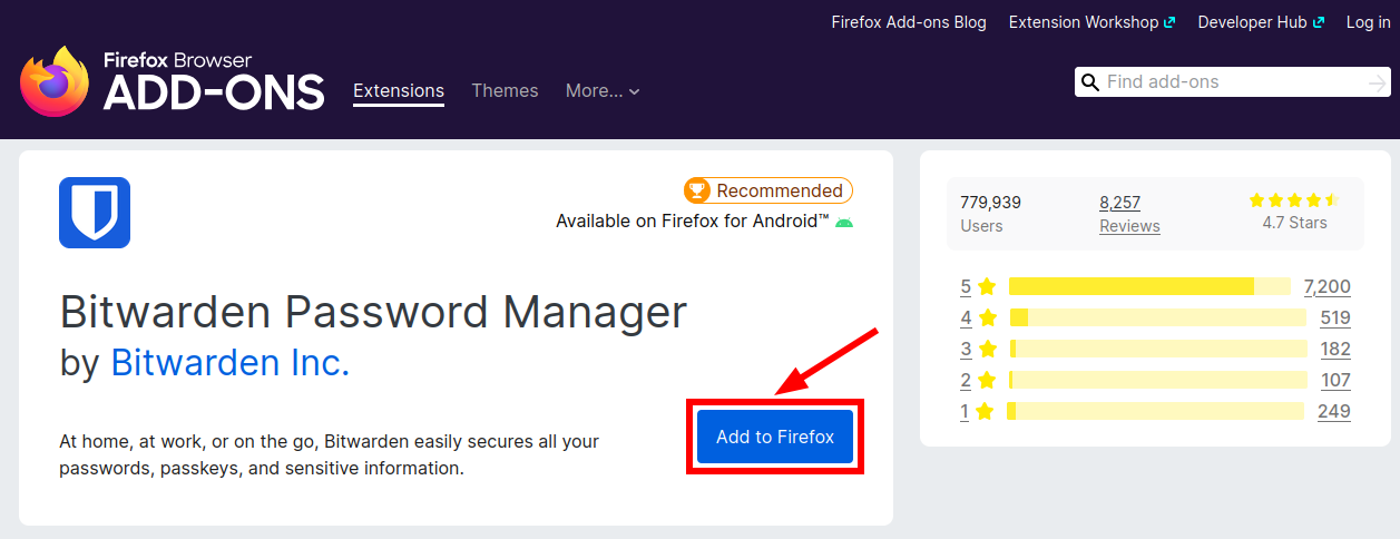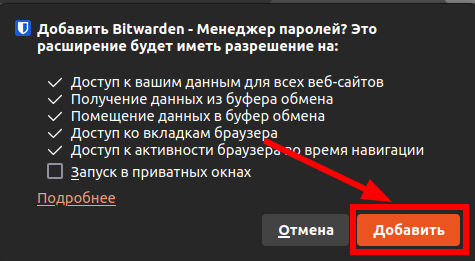 Если пользуетесь Firefox, то нужно перейти на страницуBitwarden Password Manager – Get this Extension for 🦊 Firefox и нажать “Add to Firefox”: