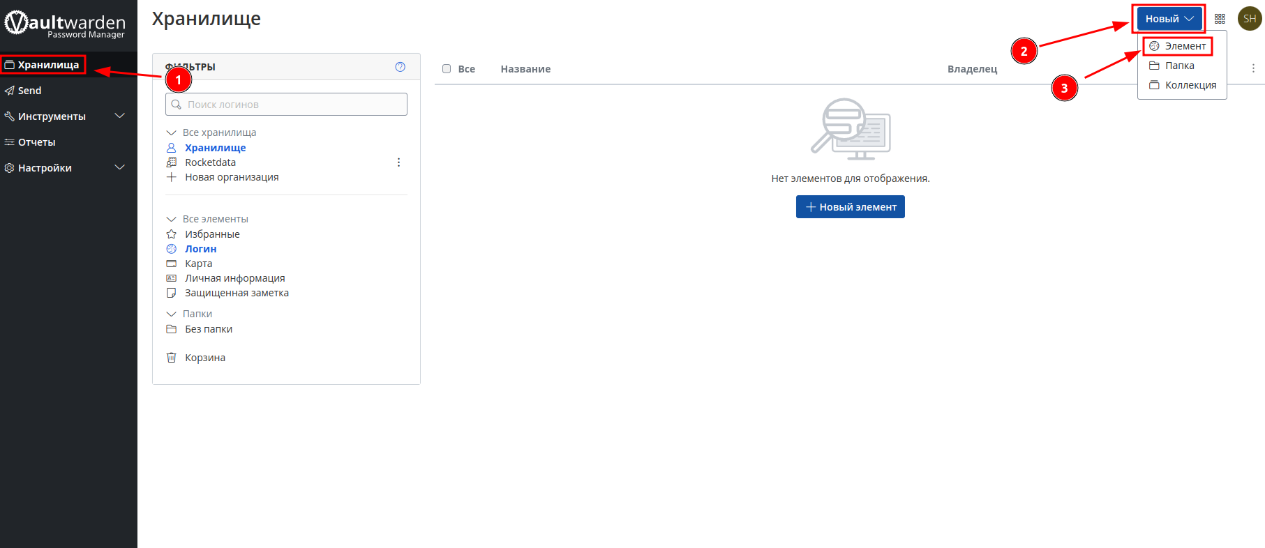 - Сначала нужно перейти в “Хранилища”, затем справа вверху нажать “Новый”, в выпадающем списке выбрать “Элемент”: