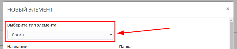 - Далее нужно выбрать тип элемента, который создаем, в поле “Выберите тип элемента”. В данном случае нужно убедиться, что выбран “Логин”: