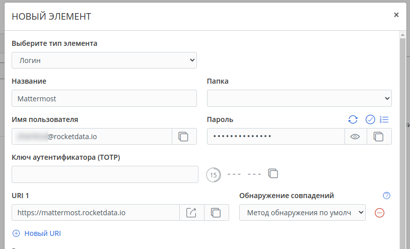 URI 1 - копируем адрес страницы входа на сайт, где будет использоваться пароль. ВАЖНО! Адрес копируем до домена верхнего уровня включительно (т.е. .by, .ru, .io, .com и так далее), например: https://mattermost.rocketdata.io. При необходимости можно нажать кнопку “Новый URI”, если пароль нужно использовать на нескольких сайтах