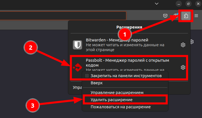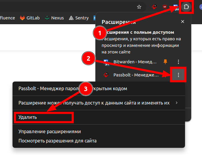 справа вверху, затем на 3 точки напротив расширения Passbolt и на кнопку "Удалить":