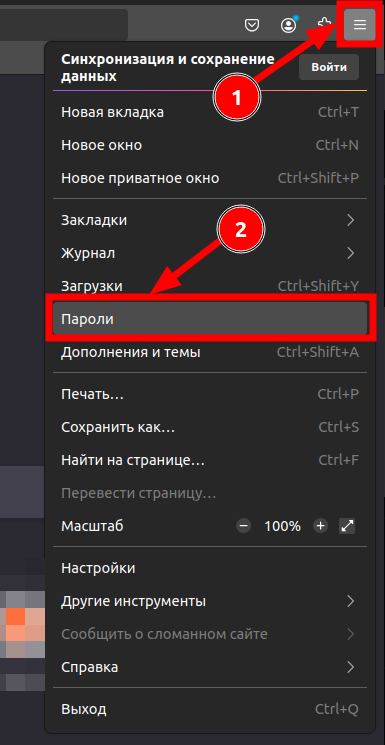 - Для перехода во встроенный менеджер паролей Firefox нужно нажать на 3 линии справа вверху, затем нажать "Пароли":