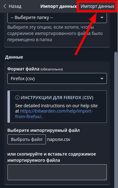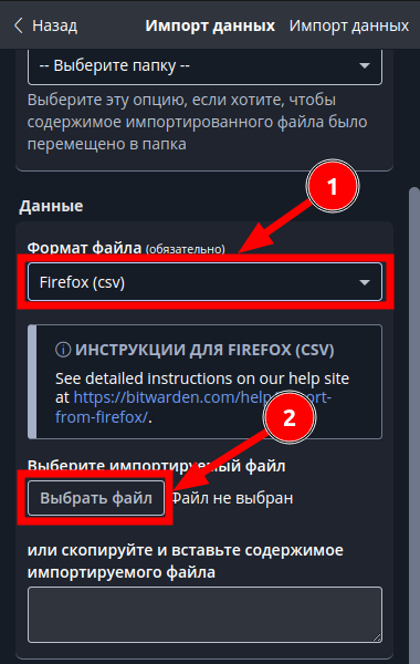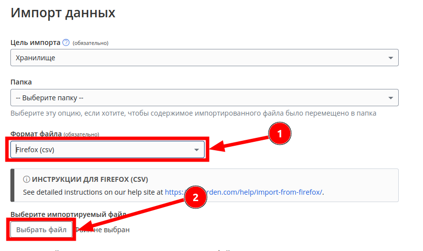 - На странице “Импорт данных” в поле “Формат файла” нужно выбрать “Firefox (csv)”, потом нажать на кнопку “Выбрать файл”: