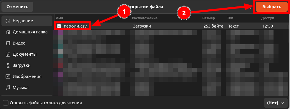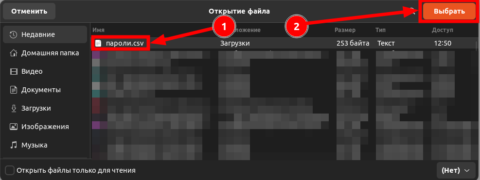 - Откроется окно импорта данных. В поле “Формат файла” нужно выбрать “Firefox (csv)”, потом нажать на кнопку “Выбрать файл”: