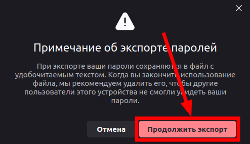 Firefox запросит подтверждение экспорта. Нужно нажать "Продолжить экспорт":