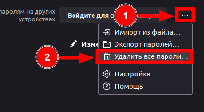 - Теперь нужно очистить менеджер паролей Firefox. Для этого нужно перейти в него как описано в пункте 1, нажать на 3 точки справа вверху окна, затем выбрать "Удалить все пароли...":