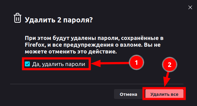 И наконец нужно поставить галочку напротив "Да, удалить пароли" и нажать "Удалить все":