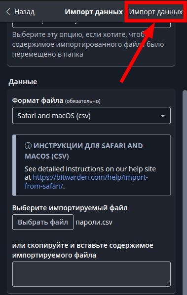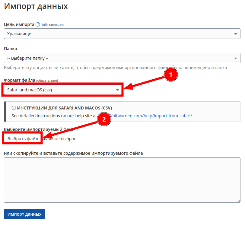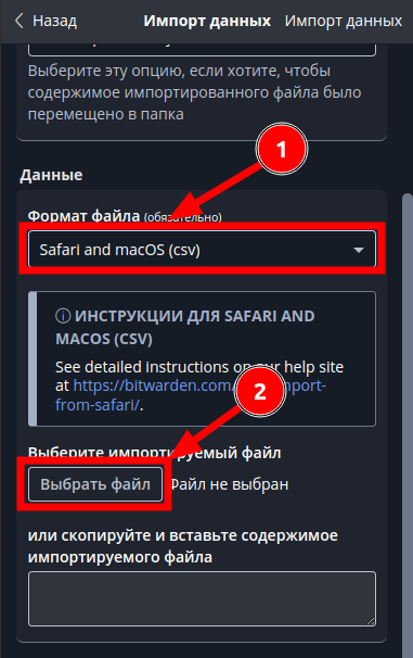 - На странице “Импорт данных” в поле “Формат файла” нужно выбрать “Safari and macOS (csv)”, потом нажать на кнопку “Выбрать файл”: