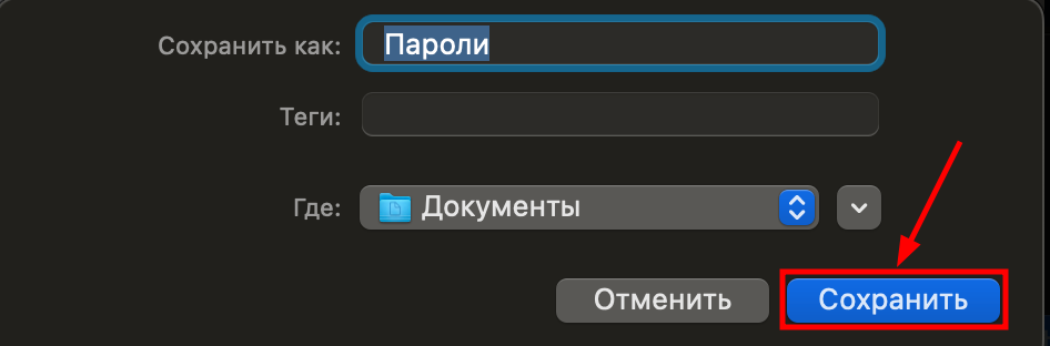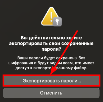 Затем нужно подтвердить экспорт, нажав "Экспортировать пароли":