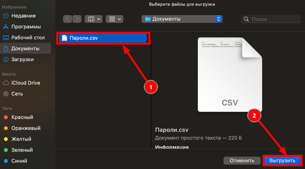 - Откроется окно импорта данных. В поле “Формат файла” нужно выбрать “Safari and macOS (csv)”, потом нажать на кнопку “Выбрать файл”: