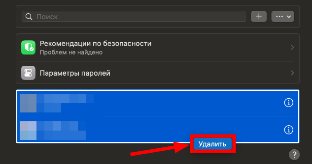 - Теперь нужно очистить менеджер паролей Safari. Для этого необходимо перейти в него как описано в пункте 1, нажать command+A, чтобы выделить все пароли, нажать правой кнопкой мыши по любому из паролей (щелчок 2-мя пальцами по тачпаду) и наконец нажать "Удалить":